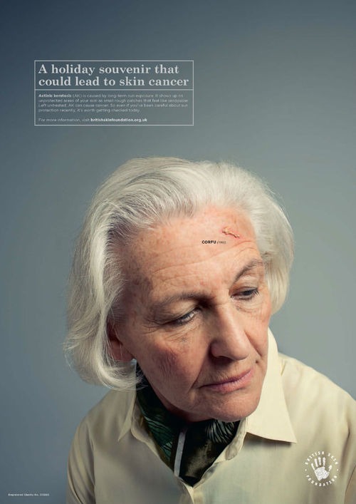 The campaign launch follows the news recently that malignant melanomas in the middle-aged have quadrupled since the 1970s, believed to be likely down to the popularity of package holidays and sunbed use in that time. Using the package holiday boom of the 1970s and 1980s as a focal point, the campaign images cleverly depict the lesions on the models’ foreheads in the shape of popular summer destinations like Tenerife, Corfu, and Sardinia. It is hoped that the images from this campaign will spur their target audience to have any suspicious lesions – those that grow in size, itch and bleed – checked out by a GP.