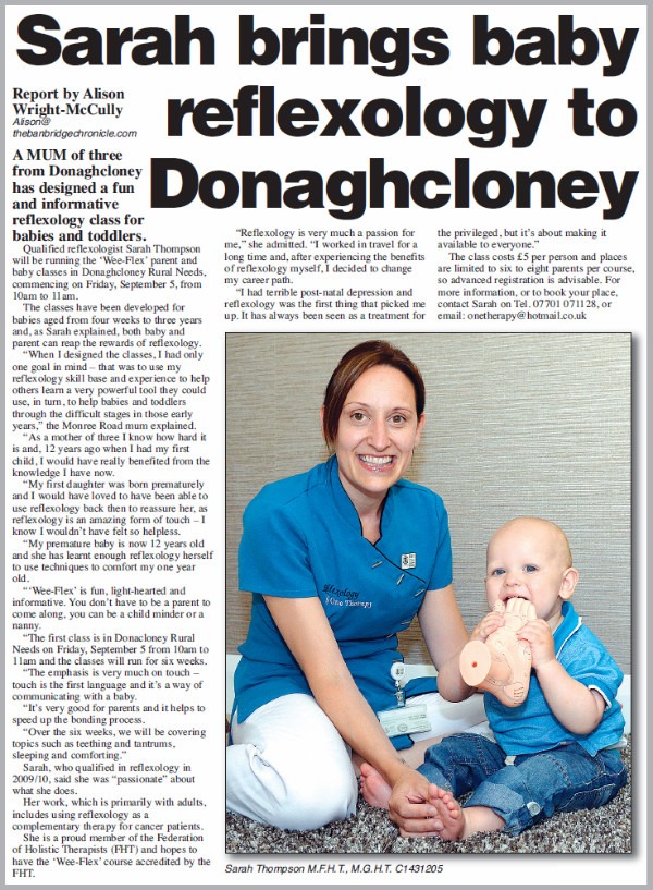 Proud FHT member and reflexologist Sarah Thompson has been featured in The Banbridge Chronicle (30 July, 2014) talking about her forthcoming Wee-flex parent and baby classes in Donoghcloney, Ireland.