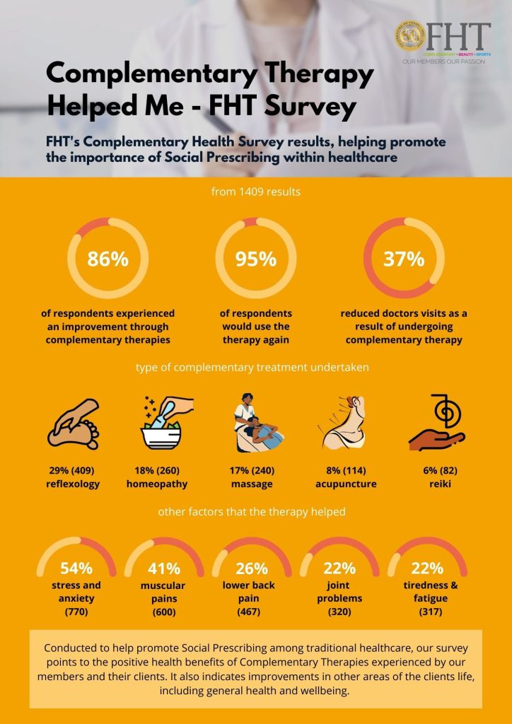 Conducted in partnership with the Integrated Medical Alliance (IMA) to help promote social prescribing among standard medical practices, the FHT survey points to the numerous health benefits of complementary therapies for both targeted and generalised health.