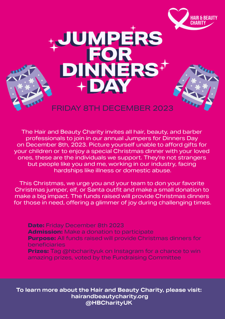On Friday 8 December, participate in the 2023 Jumpers for Dinners day organised by the Hair and Beauty Charity. This annual event encourages all hair, beauty and barber professionals, along with their teams, to don their favourite Christmas jumpers, elf attire or Santa costumes while making a small donation that can create a significant impact.