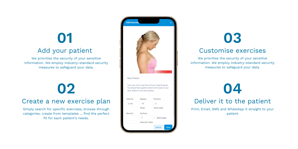Customisation: Tailor exercise plans to meet the unique needs of each client, with options to upload custom exercises or utilise pre-made advice sheets covering over 470 musculoskeletal conditions.